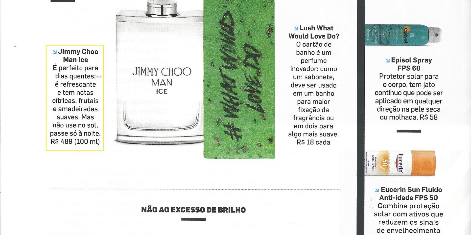 A revista VIP de janeiro traz com destaque a nova fragrância Jimmy Choo Man Ice, que chega ao Brasil pela Vizcaya Cosméticos. O perfume é uma das indicações de produto da matéria Arsenal do Verão, que lista tudo que o leitor deve possuir para enfrentar as temperaturas quentes.