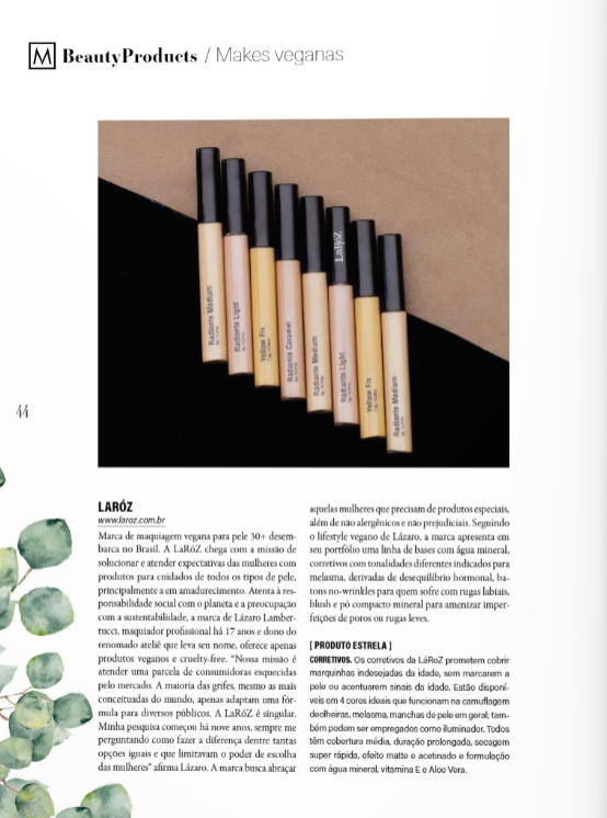 Sendo assim, a LaRóZ, marca de maquiagem vegana, assim como para pele 30+, ganha destaque na matéria “Maquiagem com Causa” da Revista HM – Make #26. Sob o mesmo ponto de vista, produtos cruelty-free, juntamente com compostos mais naturais, são alguns dos mais procurados! Ou seja, a aposta da vez é ter propósito.
